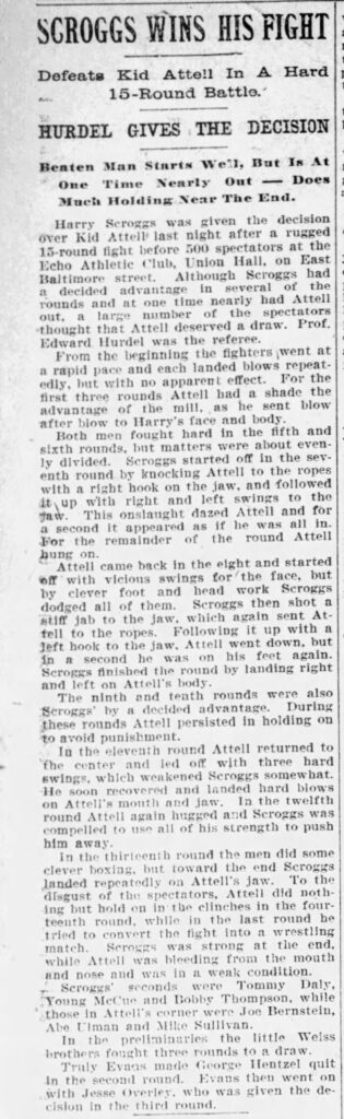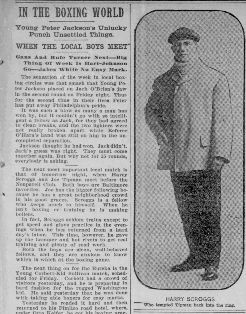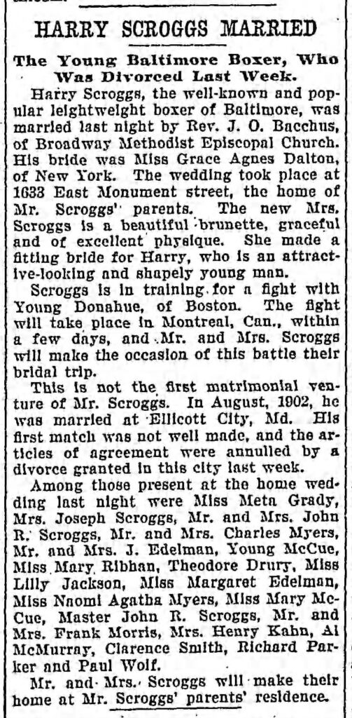 Instead of a completely factual and research focused article, this time I’m taking a risk and giving you a very rough excerpt of something I worked on over summer vacation. When I research, I try desperately to put myself in my ancestors shoes and fill in the blanks when I don’t know details—researching the time and place to help at least get me close to maybe what they experienced. For this ancestor, I wanted to put it in story form. I could have it completely wrong. I really don’t know. I based it off of first-hand accounts, newspaper articles, census records, city directories, etc. I found Thomas Scharf’s book Baltimore’s Boxing Legacy: 1893-2003 from Arcadia Publishing to be very insightful. I also added my own flare and assumptions on personality and how they interacted. Regardless, it’s a fun and imaginative exercise that gets my creative writing going—which doesn’t hurt a darn thing. Hope you enjoy this little vignette of the “based on truth” boxing days of my great-great grandfather, Harry Edward Scroggs (1883-1971).