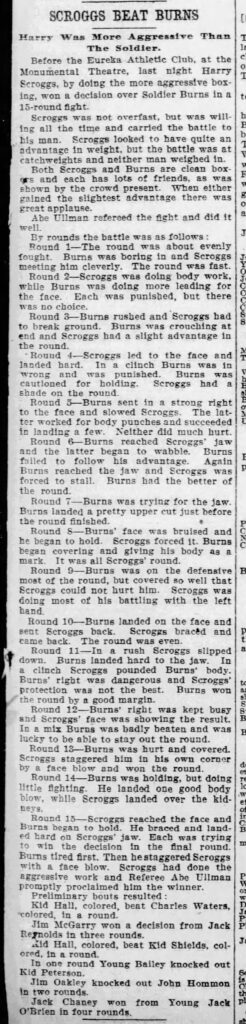 He had quit school five years earlier, and had been training since being signed as a new featherweight for promoter Al Hereford. Now 18, he took whatever matches came his way from Al. He was tired of the small time, and wondered if he could get out from the same rough crowds, little pay, and definitely no mention in the headlines. Joe had done it, so surely the scrappy and determined Scroggs could. They started around similar ages and were matched up against each other in the dirty stables behind Andy McLaughlin’s saloon on Caroline Street. There, they learned to love the cheering, the sound of their own names, and the feel of money.